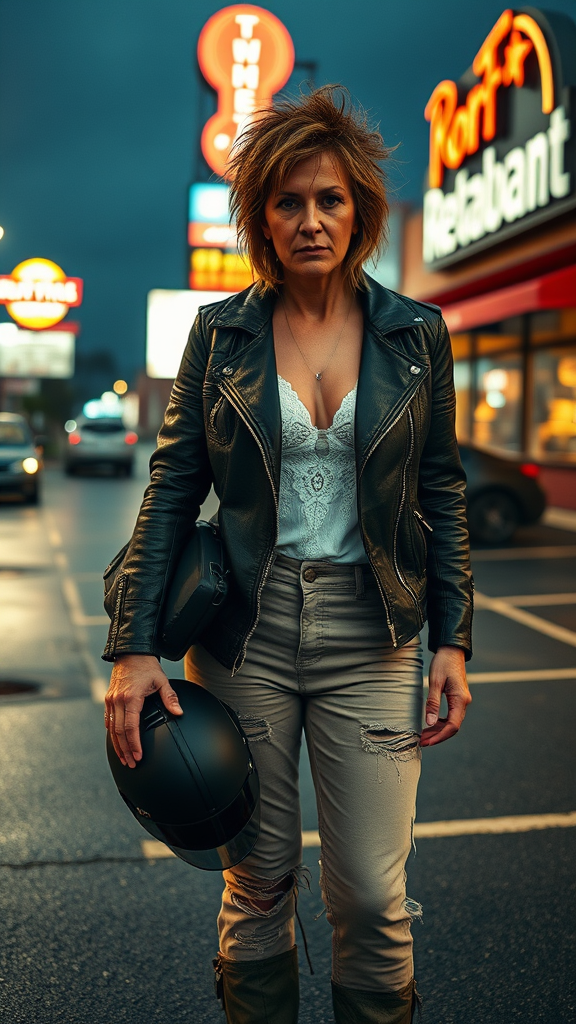 A middle-aged British woman with a punk and rebellious vibe stands with a slightly vulgar look in a dimly lit restaurant parking lot. Her messy hair frames a face that radiates boredom. She's dressed in a worn-out ensemble featuring a rugged leather jacket, distressed trousers, and scuffed ankle boots. Under the jacket, a glimpse of a vintage white lace bralette adds an unexpected delicate touch. In one hand, she casually holds a matte black helmet, suggesting a penchant for motorcycle rides. The atmosphere around her is gritty, capturing her untamed spirit against the backdrop of softly glowing restaurant signs.