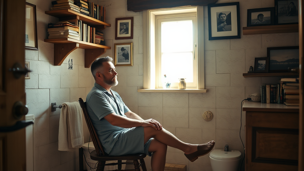 A middle-aged man, lost in thought, sits on a vintage wooden chair in the corner of his rustic bathroom, surrounded by shelves stacked with books and framed photos, the sunlight streaming softly through a small window illuminating his peaceful moment of solitude.