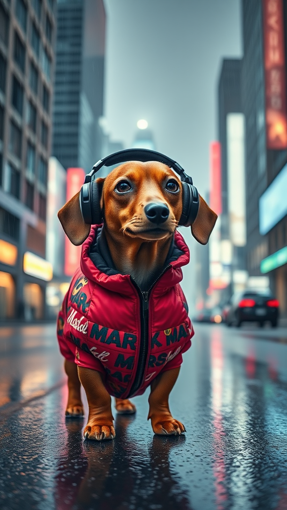 A miniature dachshund with a crimson coat and mismatched peeper, one bright blue and the other warm brown, clad in a fire-engine red down jacket with a bold graphic pattern, stands resolute on a rain-slick road in a neon-lit metropolis, enveloped in a grey mist that shrouds the skyscrapers, the sound of raindrops hitting the pavement punctuated only by the thumping bass of large, sleek Marshall headphones that seem to be holding its ears hostage to the city's vibrant rhythm, its little body seeming to sway ever so slightly to the beat, a juxtaposition of high-tech and high-energy world against a pint-sized, old-world pup.