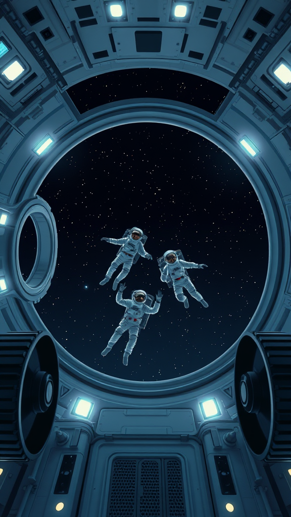 A minimalist and futuristic depiction of a scene reminiscent of an 80s movie, showing two astronauts gracefully floating in zero gravity. Viewed from above, the setting includes an open circular hatch on one side, framed by large black wheels and glowing lights, against the backdrop of a starry night sky in the vast darkness of space. The artwork is in the style of John Berkey, with subtle creative modifications to add a unique twist to the original concept.