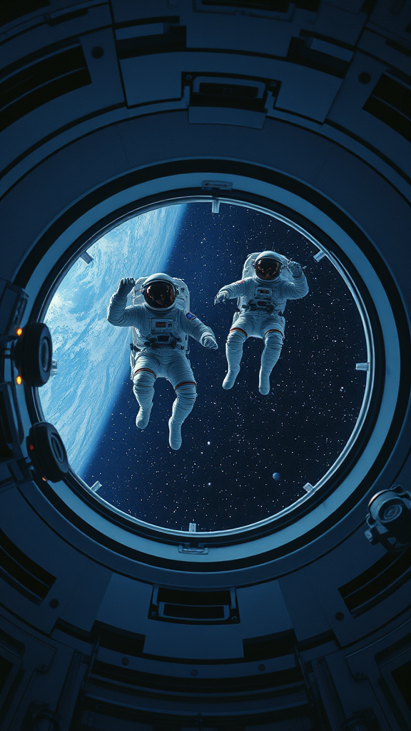 A minimalist and futuristic depiction of two astronauts floating in zero gravity, viewed from above in the interior of a spacecraft. An open circular hatch with large black wheels and lights is visible on one side, set against the backdrop of a starry night sky in the vastness of space. The style evokes the work of John Berkey, with an 80s movie aesthetic, blending sleek design elements with a cosmic setting.