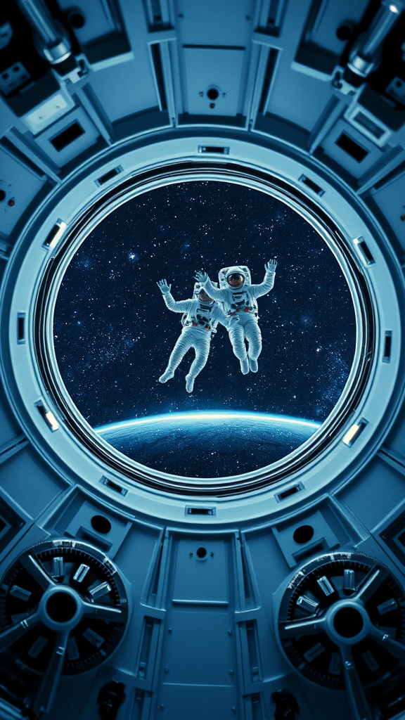 A minimalist and futuristic scene capturing an 80s-inspired cinematic still: two astronauts gracefully float in zero gravity from a top-down perspective, surrounded by the sterile, yet intricate environment of their spacecraft. An open circular hatch bordered by large, black wheels and glowing lights commands attention, with the vast, starry night sky of space stretching out beyond. The scene's style evokes the imaginative and detailed aesthetic of John Berkey, blending stark, clean lines with a sense of boundless adventure.