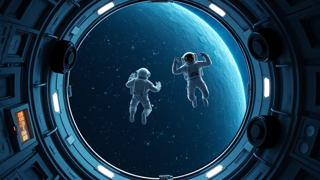 A minimalist and futuristic scene inspired by 80s movie aesthetics shows two astronauts gracefully floating in zero gravity inside a spacecraft. From an overhead view, an open circular hatch with large black wheels and glowing lights can be seen on one side. The spacecraft interior is sleek and streamlined, showcasing advanced technology. Through the hatch, the vast, starry night sky stretches into the dark expanse of space, reminiscent of John Berkey's artistic style. The composition captures a sense of exploration and wonder.