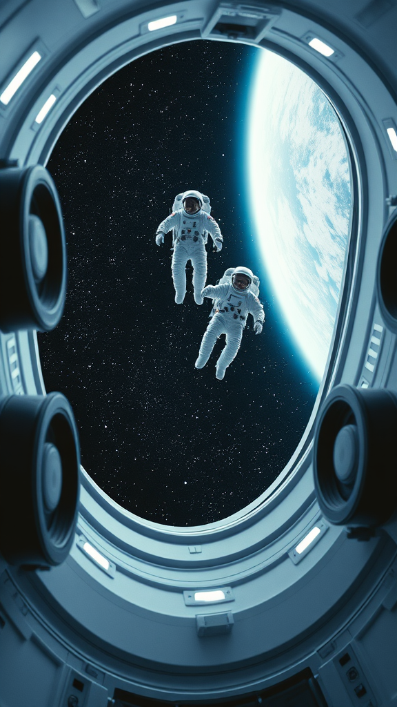 A minimalist and futuristic scene inspired by an 80s movie: two astronauts floating weightlessly inside a spacecraft. The view is from above, showcasing an open circular hatch to the side, bordered by large black wheels and glowing lights. Outside, the vastness of space reveals a starry night sky reminiscent of John Berkey's art. The focus is on clean lines and simplicity, capturing a sense of wonder and exploration.