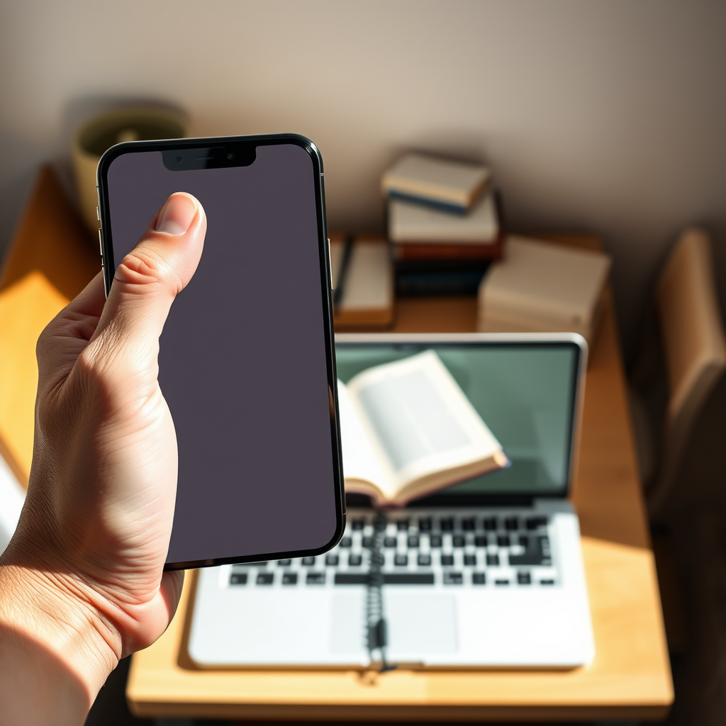 A minimalist and realistic image of a person holding an iPhone, featuring a detailed picture of a serene study space with books and a laptop, embodying a studyblr aesthetic, captured in natural light with soft shadows, maintaining a raw and authentic vibe, vivid clarity, and intricate textures.