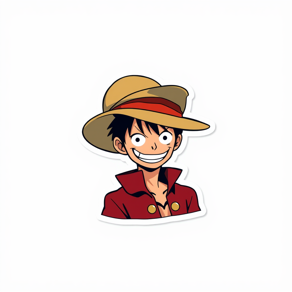 A minimalist anime-inspired sticker design featuring Monkey D. Luffy from One Piece, showcasing his iconic straw hat and a confident smirk. The artwork embraces a sleek style with a vibrant color palette, focusing on Luffy's adventurous spirit and charismatic personality while maintaining a portrait-oriented 2:3 aspect ratio.
