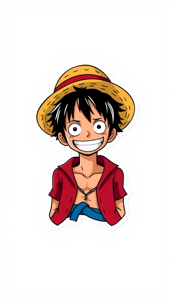 A minimalist anime-style sticker of Monkey D. Luffy from One Piece, featuring his iconic straw hat, exuding happiness and success, designed to be visually appealing and trending on ArtStation, with a focus on simplicity and a vibrant color palette, capturing the essence of adventure and charisma in the character's expression, set against a clean and modern background.
