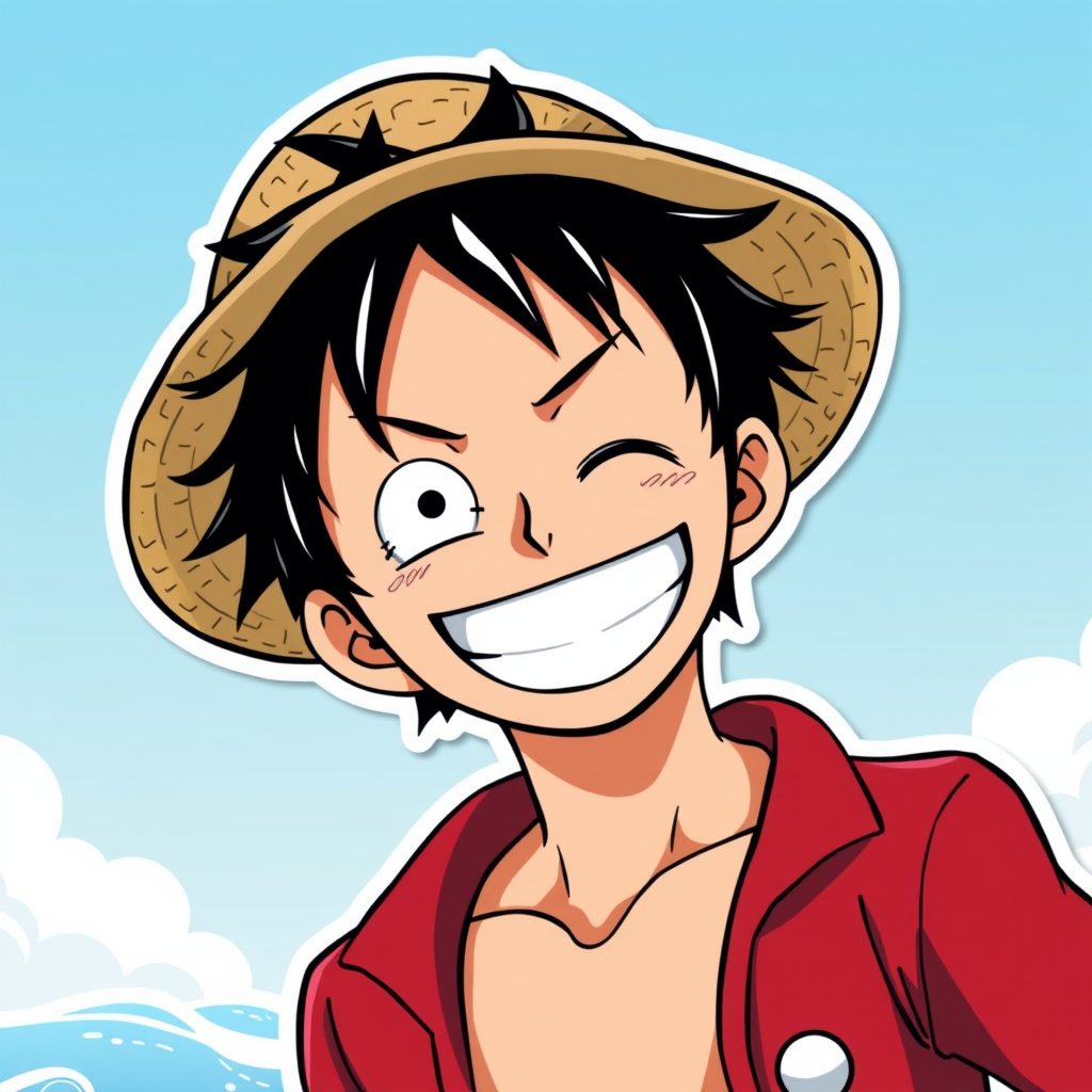 A minimalist anime-style sticker of Monkey D. Luffy from One Piece, featuring his iconic straw hat and a joyful, triumphant expression, infused with creativity and trending on ArtStation. Adjustments allow for a subtle sea-inspired background, emphasizing Luffy's adventurous spirit, all while maintaining a sleek and vibrant color palette in a 2:3 aspect ratio.