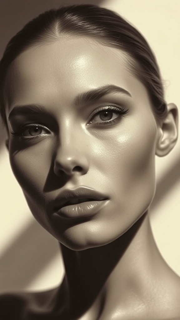 A minimalist beauty captures a black and white photograph of a woman, her serene face framed by sharp edges and bathed in light bronze hues, creating a striking interplay with deep bronze shadows. The high-definition image emphasizes contrast shading, embodying a realistic essence while echoing the calm sophistication of karencore aesthetics.