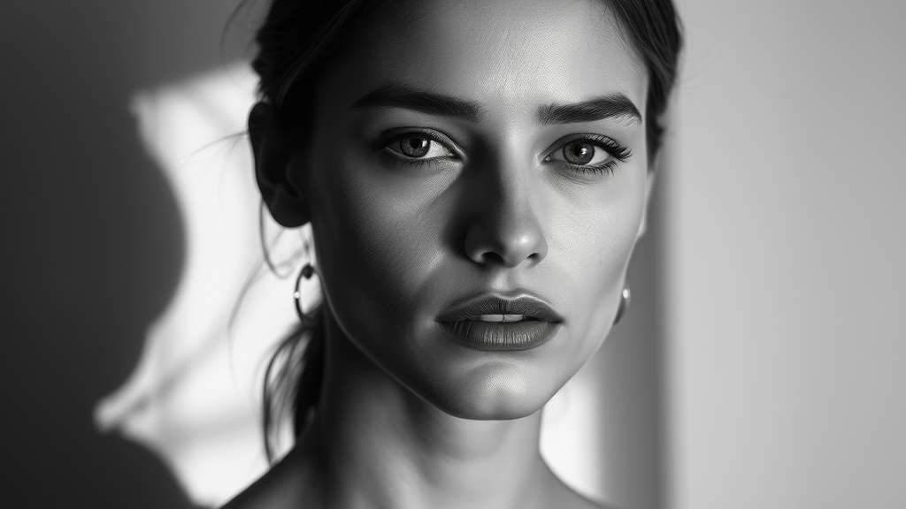A minimalist beauty captures a high-definition black and white photo of a serene woman, her face gracefully framed by contrasting shadows. Her visage, in shades of light bronze and bronze, reveals sharp edges exuding karencore elegance. The realism of her expression is enhanced by exquisite contrast shading, giving depth to her contemplative gaze. The composition, with an aspect ratio of 3:5, emphasizes her timeless presence, subtly modern yet classic in its execution.