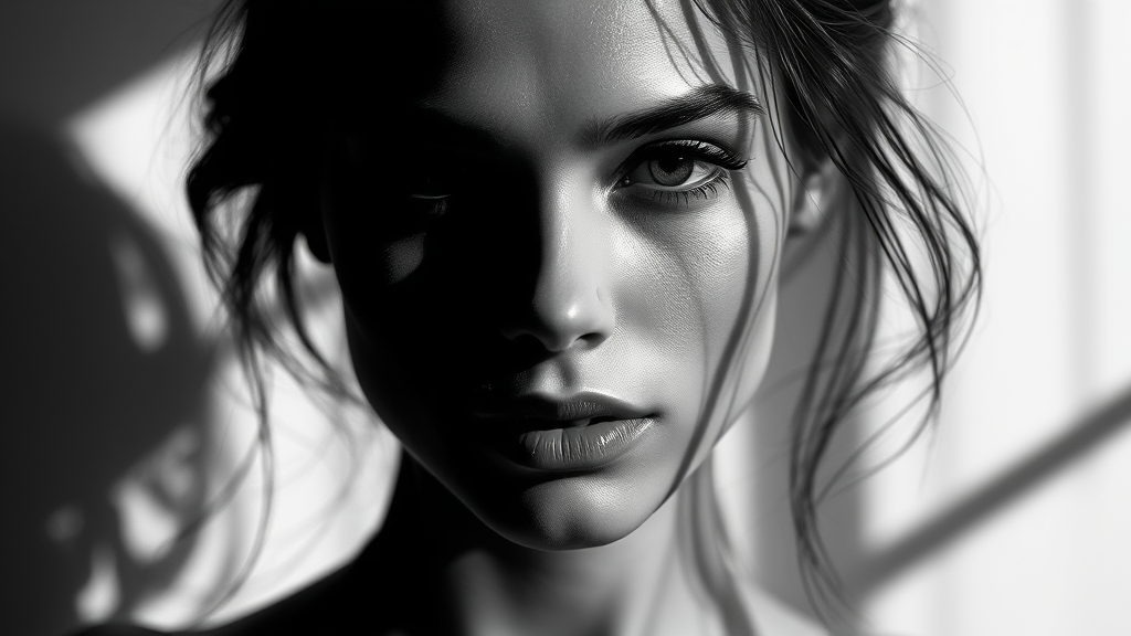 A minimalist beauty portrayal of a woman in black and white, her serene face accented with light bronze and bronze tones, surrounded by intriguing shadows. The image features sharp edges and captures the essence of karencore style, with high definition and intense contrast shading, exuding realism. The composition is graceful and poised, with an air of tranquility, set in an aspect ratio of 3:5, embodying a raw, stylized elegance.