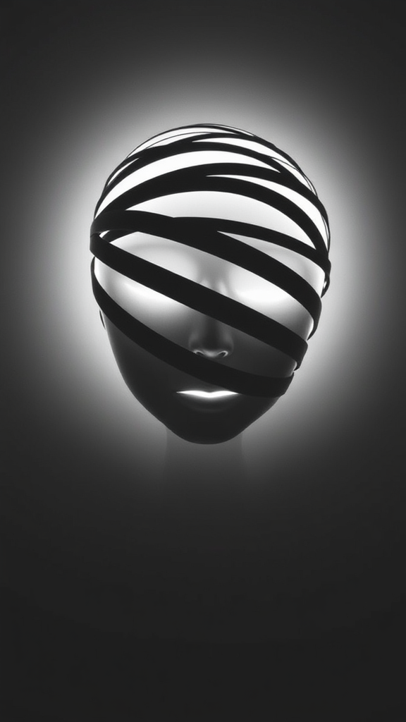 A minimalist black and white photograph featuring a face, where the head is crafted from interwoven bands of light, creating a compelling play of light and shadow. The image emphasizes stark contrasts and clean lines, combining elements of graphic design with the simplicity of monochrome tones, evoking a sense of modern elegance and abstraction.