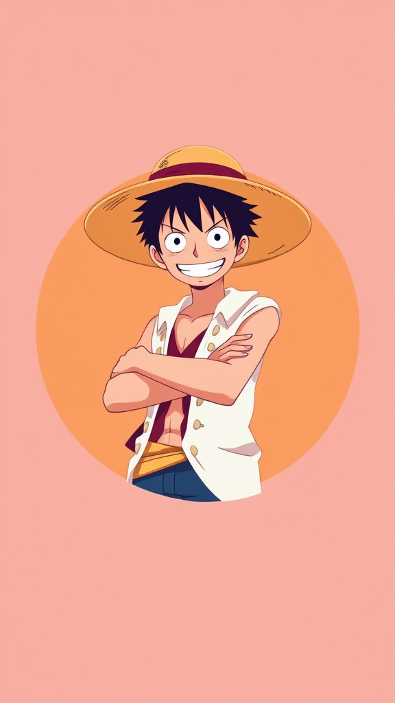 A minimalist design featuring Monkey D. Luffy from One Piece with his iconic straw hat and a confident smirk, rendered in anime style, inspired by trending art styles seen on ArtStation, with a vibrant color palette and dynamic pose that captures his adventurous spirit and charismatic energy.