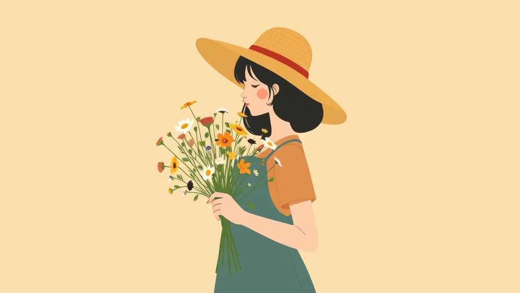 A minimalist flat illustration featuring a girl with a wide-brimmed hat, holding a bouquet of wildflowers. The design emphasizes warm earthy tones, embraces a utilitarian aesthetic, and incorporates geometric shapes, reflecting the simplicity and elegance of Danish design sensibilities.