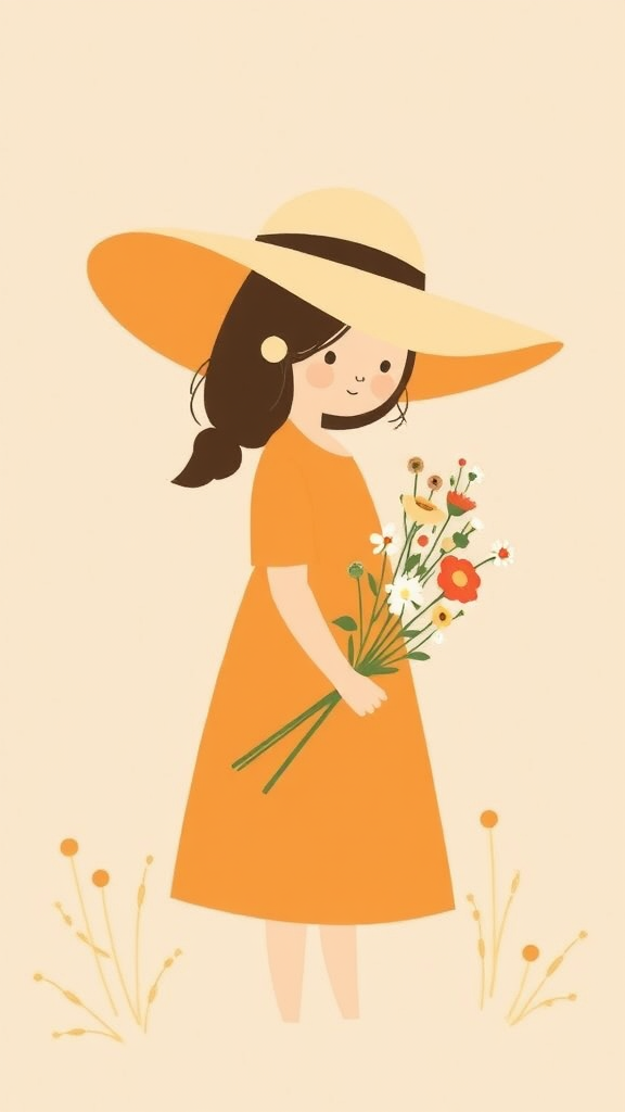 A minimalist flat illustration of a girl in a wide-brimmed hat, clutching a bouquet of wildflowers, featuring warm earth tones and simple geometric shapes, inspired by Danish design aesthetics with a touch of utilitarian elegance.