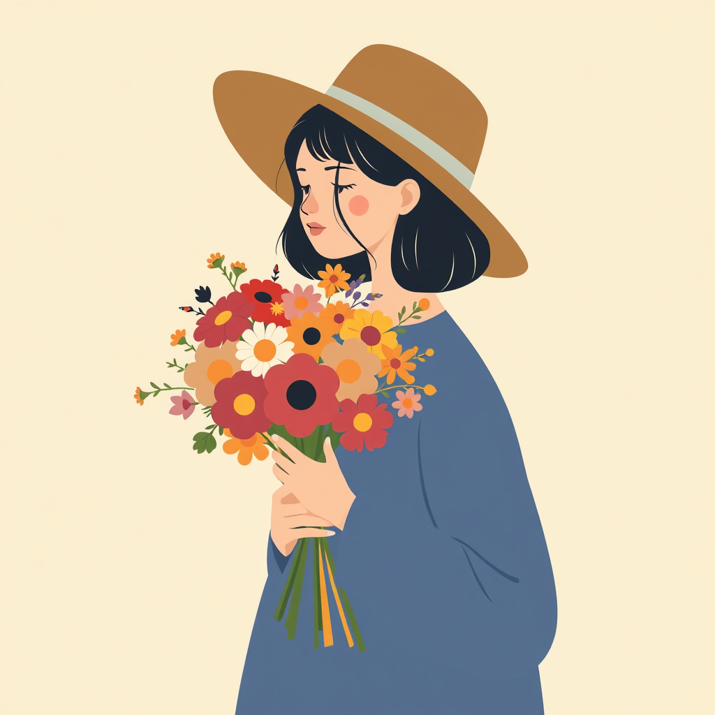A minimalist flat illustration of a girl with a hat holding a bouquet of colorful flowers, featuring geometric shapes and warm tones, inspired by Danish design elements, reflecting a utilitarian aesthetic with a softly textured background.