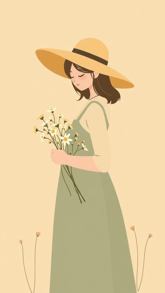 A minimalist flat illustration of a girl with a wide-brimmed hat, gently clutching a bouquet of wildflowers, characterized by warm earth tones, simple shapes, and clean lines, inspired by Danish design principles with an emphasis on geometric patterns and utilitarian aesthetics, capturing a sense of calm and simplicity.