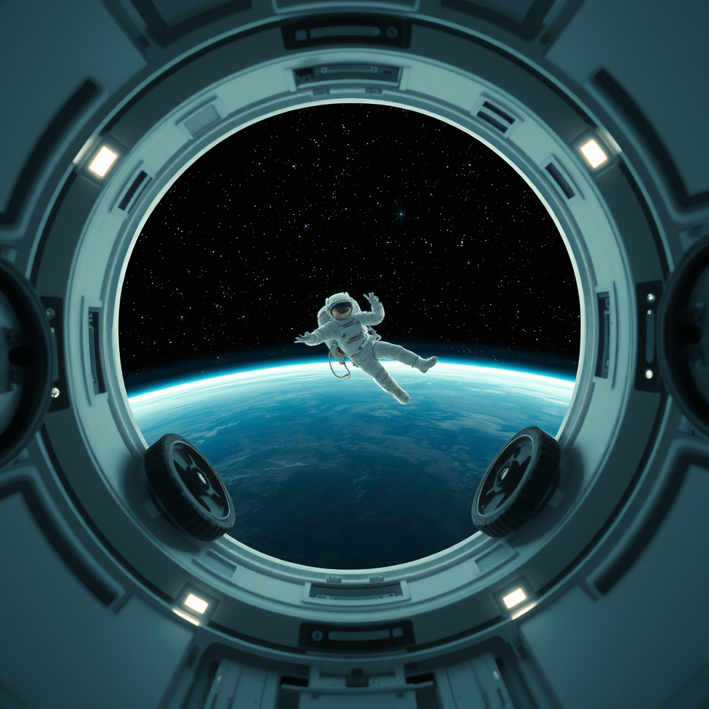 A minimalist, futuristic scene depicting two astronauts suspended in zero gravity, viewed from above. They float gracefully inside a spacecraft, surrounded by an open circular hatch adorned with large black wheels and subtle lights. The vast, starry expanse of space forms the backdrop, evoking a sense of wonder. Influenced by the artistic style of John Berkey, the composition maintains an elegant balance between simplicity and intricate detail.