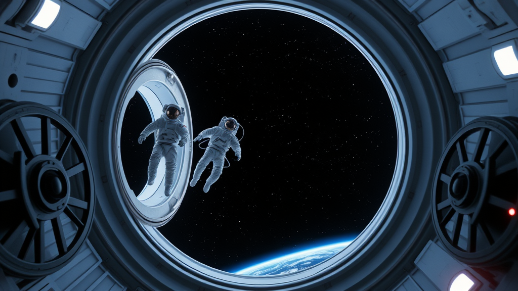 A minimalist, futuristic scene inspired by an 80s movie, showcasing two astronauts gracefully floating in zero gravity from an overhead perspective. They hover near an open circular hatch on one side, flanked by large, intricate black wheels and glowing lights. Beyond them, a vast, starry night sky stretches across the dark expanse of space, evoking the style of John Berkey. The visual is both sleek and atmospheric, capturing the grandeur and isolation of space exploration with small creative nuances.