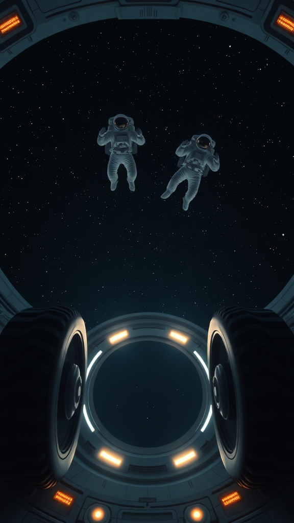 A minimalist, futuristic scene reminiscent of an 80s movie depicts two astronauts gracefully floating in zero gravity from an aerial perspective. Below them, an open circular hatch is visible, surrounded by large black wheels and glowing lights that cast subtle reflections. The vast background reveals a starry night sky, merging into the dark, infinite expanse of space. This imagery is inspired by the evocative style of John Berkey, emphasizing a sleek, streamlined aesthetic with an emphasis on scale and depth.