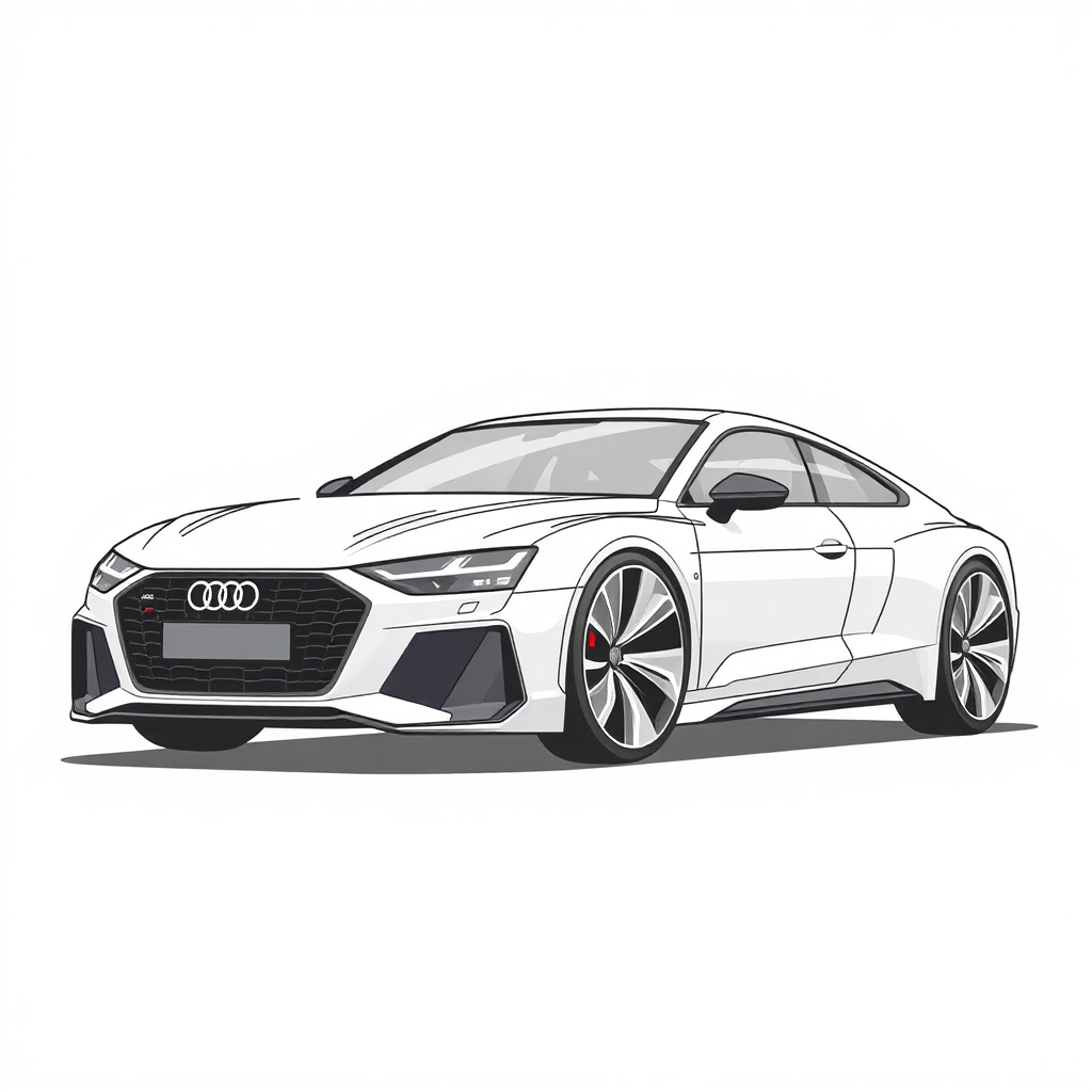A minimalist illustration of the Audi RS8 concept, featuring a traditional oil painting style with a white background. The design incorporates simplistic cartoon elements and larme kei influences, with simple line work in gray tones. Subtle creative modifications enhance the elegant curves and futuristic elements of the car, adding a touch of whimsy while maintaining the core essence of the concept.