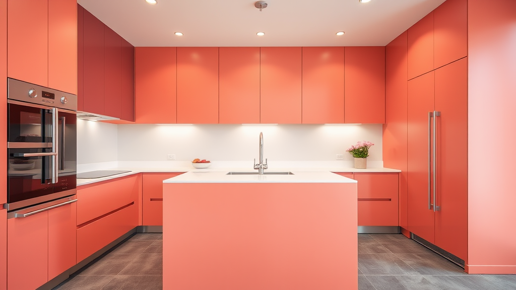 A minimalist kitchen with a sleek, matte coral finish is the focal point, featuring a modern silver faucet. Integrated high-end appliances maintain the streamlined look, complemented by matte warm grey tile flooring that adds coolness and texture. Recessed ceiling lighting casts a soft, even glow, highlighting smooth surfaces and clean lines, creating a seamless blend of style and function in an updated contemporary space, captured in UHD with a 9:16 aspect ratio.