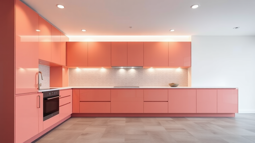 A minimalist kitchen with a sleek, matte coral finish is captured in a captivating photograph. The design boasts clean, modern lines, featuring a polished silver faucet and seamlessly integrated high-end appliances that maintain the streamlined aesthetic. The flooring, composed of matte warm grey tiles, introduces a cool texture to the space. Recessed lighting from the ceiling casts a gentle, even glow, enhancing the smooth surfaces and clean lines, all while highlighting the kitchen's understated elegance. The simple ceiling design complements the overall soothing ambiance. A hint of creative flair is added with subtly patterned backsplash tiles that echo the warm grey tones. UHD --ar 9:16.
