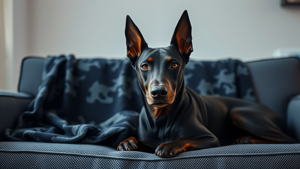 A minimalist photo studio showcases a dark scheme camouflage pattern blanket draped over a matching textured sofa. In the foreground, a sleek black Doberman rests, its sharp gaze locked onto the camera. The photo's front view captures the intricate details of the blanket and the dog's glossy coat, set against a blurred backdrop that enhances depth of field. With the realism of dusk sunlight casting gentle highlights, the scene is ultra-realistic in UHD resolution, embodying a raw but artistically stylized essence.