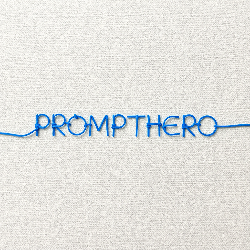 A minimalist representation of the word "PROMPTHERO" shaped by a continuous piece of blue thread on a beige canvas. The thread weaves and loops seamlessly to construct each letter, utilizing open spaces to enhance legibility. The design epitomizes unity and resilience. The composition is understated yet intricate. The aesthetic is sophisticated, symbolizing a profound interpretation of connection through the art of threading. The creation is both innovative and elegantly captures the essence of weaving stories through boundless threads.
