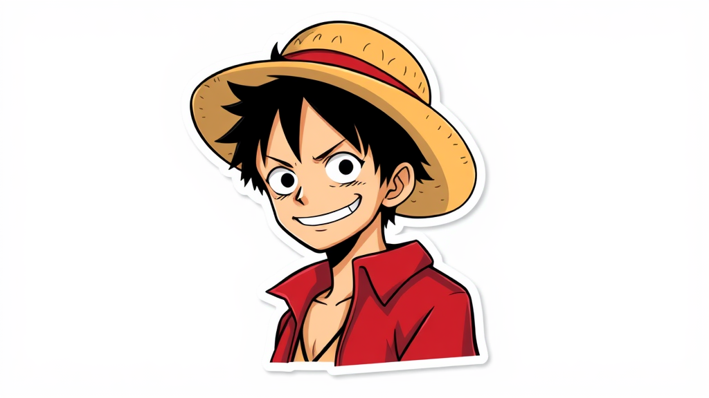 A minimalist sticker design of Monkey D. Luffy from One Piece featuring his iconic straw hat and a confident smirk, rendered in a simplified anime style with bold lines and subtle texturing, capturing his adventurous spirit in a sleek and modern aesthetic.