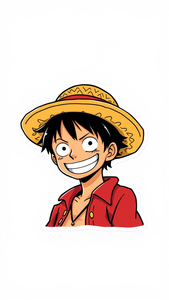 A minimalist sticker design of Monkey D. Luffy from One Piece, featuring his iconic straw hat and signature smirk, rendered in an anime style. The image is vibrant and eye-catching, capturing Luffy's adventurous spirit with bold outlines and a simplified color palette, making it suitable for trending platforms like ArtStation. The background incorporates subtle patterns reminiscent of ocean waves to hint at his pirate adventures, maintaining the 2:3 aspect ratio.
