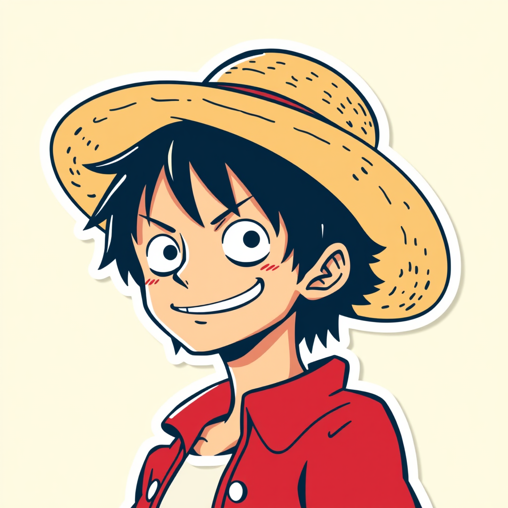 A minimalist sticker design of Monkey D. Luffy from One Piece, featuring his signature straw hat tilted slightly, a confident smirk on his face, capturing his adventurous spirit, with bold anime lines and a slightly retro color palette, aspect ratio 2:3, stylized with a touch of whimsy and a vibrant yet simple background.