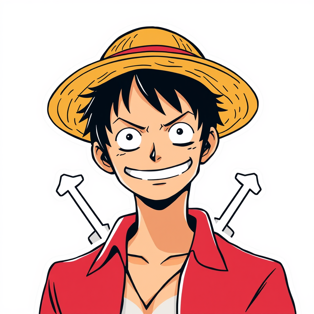 A minimalist sticker design of Monkey D. Luffy from One Piece, featuring his iconic straw hat and a playful smirk, rendered in a sleek anime style with bold lines and vibrant colors. The composition focuses on his spirited expression, capturing his adventurous spirit. The design incorporates subtle nautical elements in the background, adding a unique twist to the look. The piece is crafted to appeal to contemporary art trends, making it a standout feature on platforms like ArtStation.