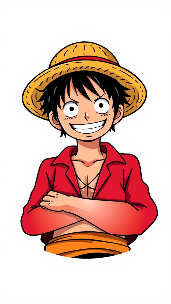 A minimalist sticker design of Monkey D. Luffy from One Piece, featuring his iconic straw hat and a confident smirk, captured in a sleek anime style with a touch of playful flair, set in a vibrant 2:3 aspect ratio with a subtle stylized twist.