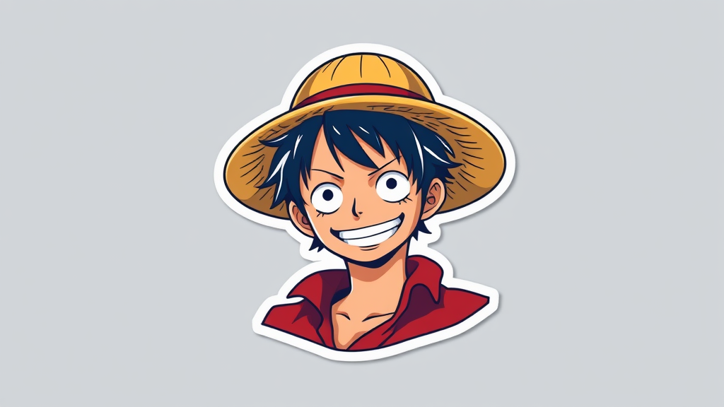 A minimalist sticker design of Monkey D. Luffy from One Piece, featuring his iconic straw hat and signature smirk in an anime style, with a touch of artistic flair highlighting his adventurous spirit, vibrant colors and sleek lines, inspired by trending styles on ArtStation, aspect ratio 2:3, with a splash of niji artistic influence.