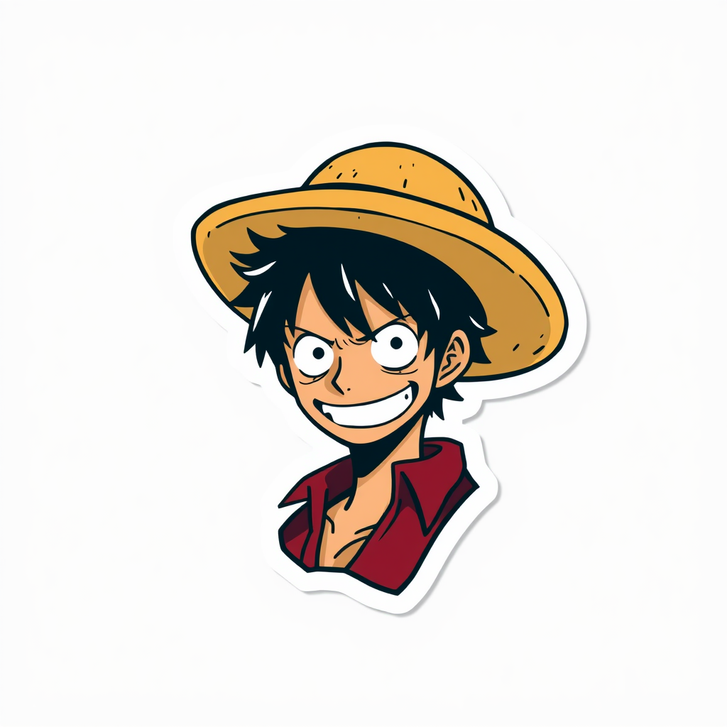 A minimalist sticker design of Monkey D. Luffy from One Piece, featuring his iconic straw hat and signature smirk, rendered in a sleek anime style. The composition emphasizes bold, clean lines with a hint of dynamic energy, and its vibrant colors are trending on ArtStation. The piece captures Luffy's adventurous spirit and charismatic flair in a unique artistic twist that retains the essence of the original character.