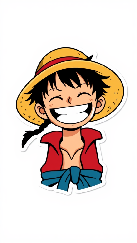 A minimalist sticker design of Monkey D. Luffy from One Piece, featuring his iconic straw hat and a joyful expression, capturing the essence of his adventurous spirit and success. The style is anime-inspired with clean lines and a vibrant color palette. This design emphasizes simplicity while showcasing Luffy's charismatic personality, making it a trending piece on ArtStation. The artwork is formatted in a 2:3 aspect ratio, adding a modern twist to the classic character.