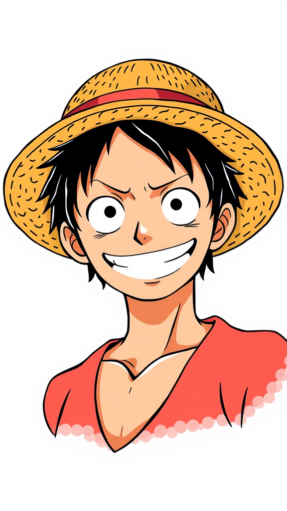 A minimalist sticker of Monkey D. Luffy from One Piece showcasing his iconic straw hat and mischievous smirk, captured in an anime style with bold lines and vibrant colors. The design is trending on ArtStation and features a unique twist: Luffy’s expression is accentuated by subtle shadowing, and the background incorporates a playful nautical theme, enhancing the adventurous spirit of the piece in a 2:3 aspect ratio with a refined artistic quality reminiscent of the Niji style.