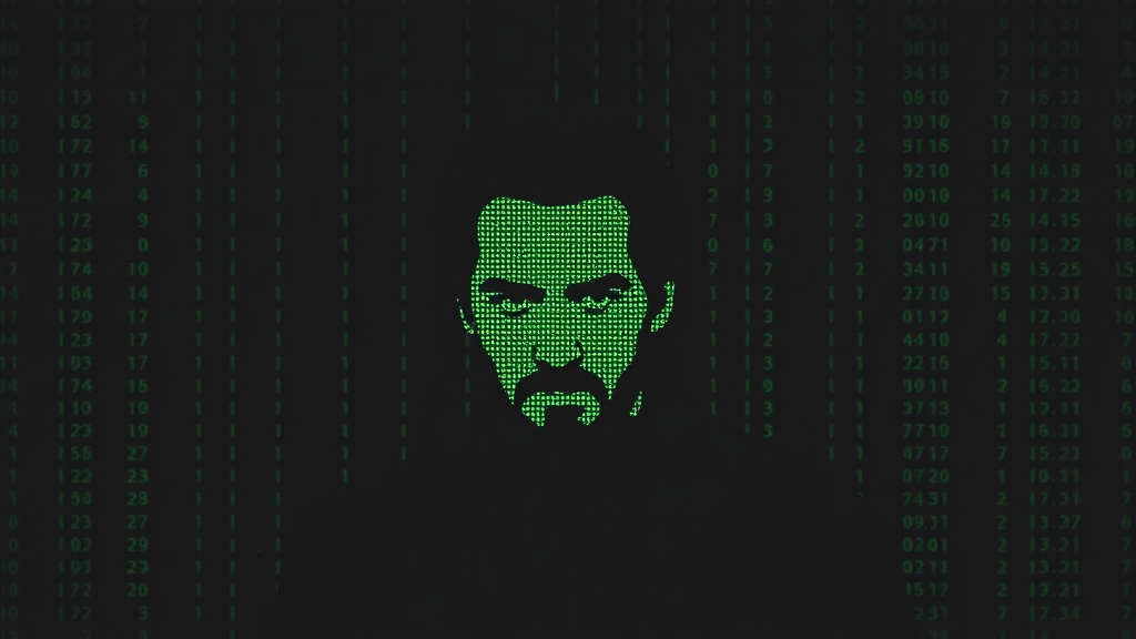 A minimalist vector illustration featuring the silhouette of Keanu Reeves, composed of simple green number dots against a splashed black matrix background. The image employs straightforward shapes and lines, capturing his likeness in a sleek, modern style. The overall composition is elongated vertically, maintaining an aspect ratio of 9:16, with subtle creative touches to enhance the raw, digital aesthetic.