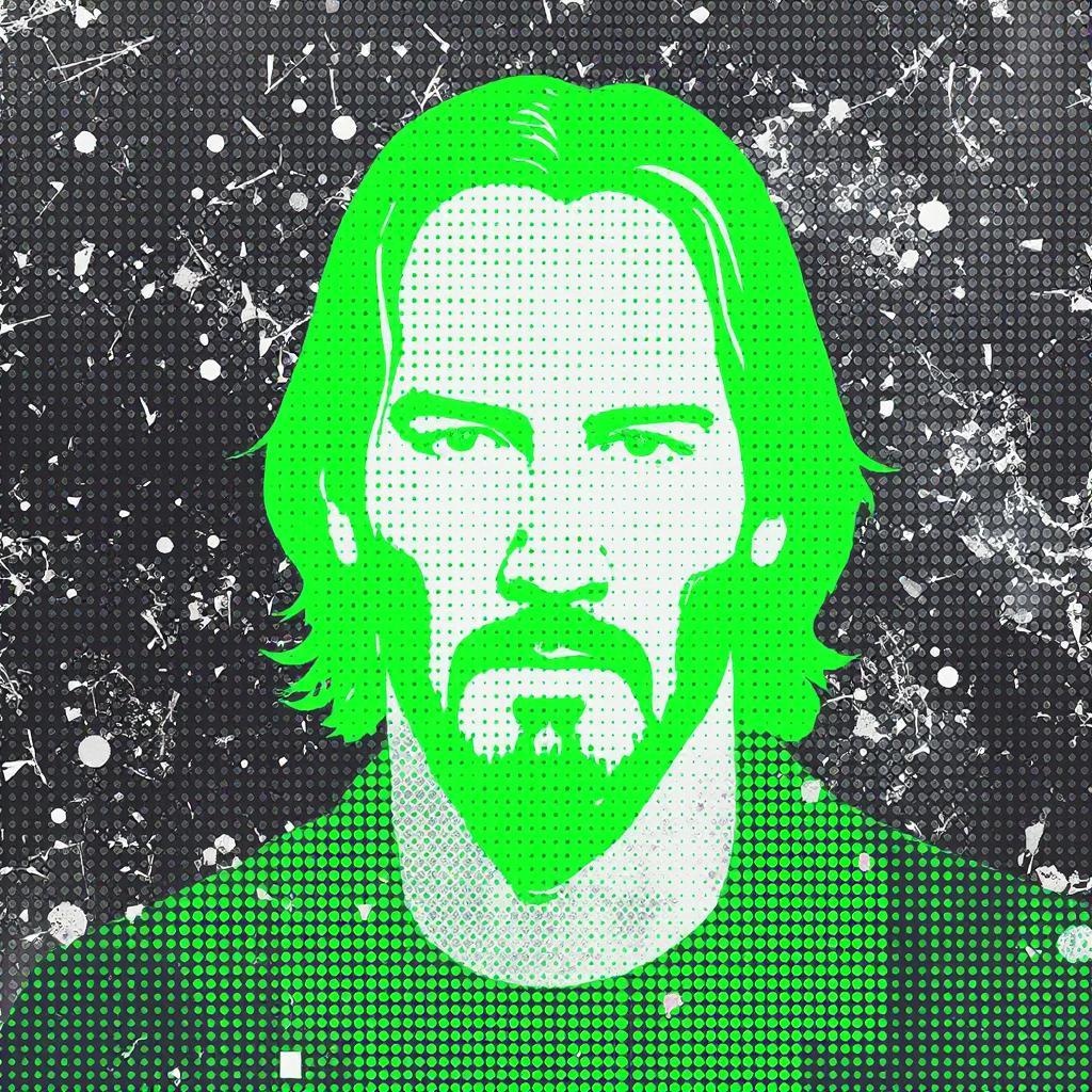 A minimalist vector illustration of Keanu Reeves featuring simple green dots arranged to form his shape, set against a splattered black matrix background. The design incorporates basic shapes and lines with a minimalistic approach, maintaining a raw and artistic flair. The aspect ratio is 9:16, with subtle creative touches to enhance the original concept.