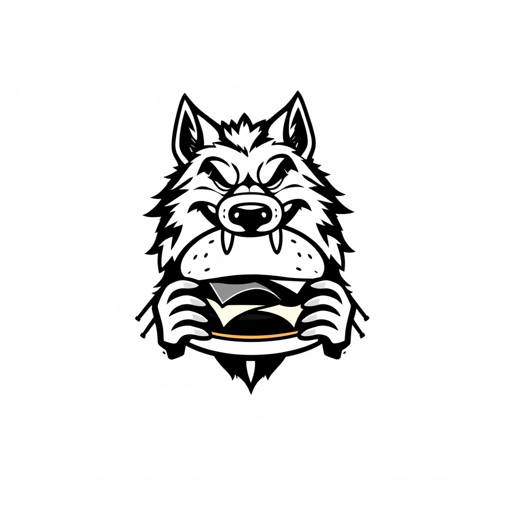 A minimalist vector logo design featuring a Wolfman with distinctive wolf-like features joyfully indulging in a large, juicy burger. The design is rendered in sleek black lines on a crisp white background, capturing the playful essence of a mythical creature enjoying a modern delight. The Wolfman's eyes are closed in satisfaction, emphasizing the enjoyment of the meal, while maintaining the clean, simplistic aesthetic of the logo.