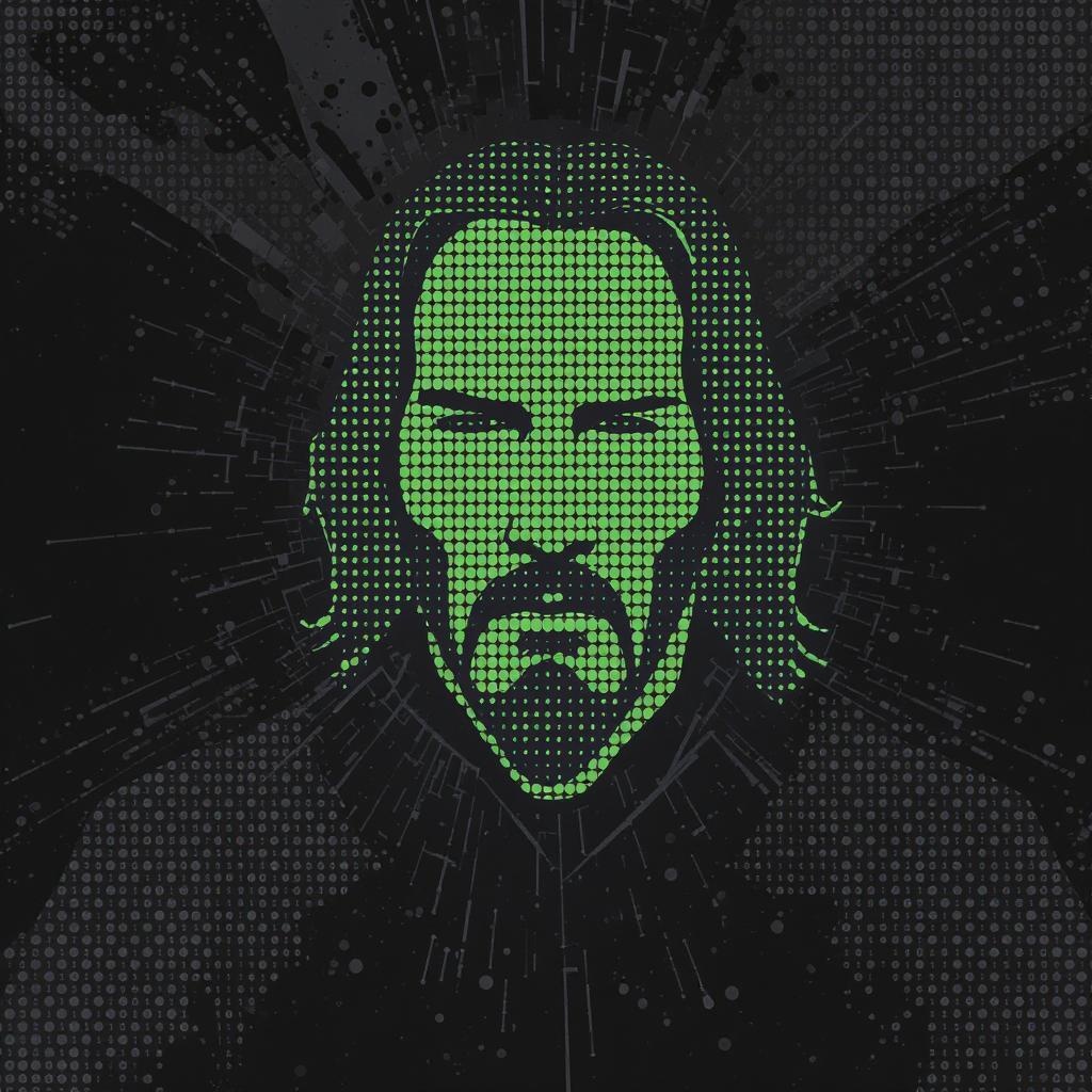 A minimalistic vector illustration of Keanu Reeves' silhouette formed by simple green number dots on a dynamic splashed black matrix background, featuring flat design elements and clean, geometric lines to accentuate the figure against the abstract backdrop, maintaining a 9:16 aspect ratio while making subtle creative adjustments for a unique interpretation.