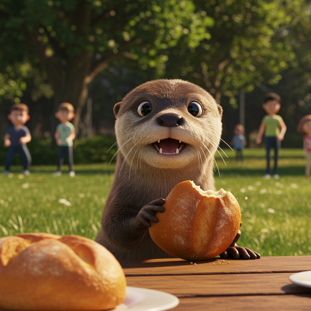 A mischievous and adorable otter with wide, sparkling eyes sneaks up to a picnic table set in a lush, sun-dappled park. Its sleek fur glistens as it climbs up, driven by the tantalizing aroma of freshly baked bread. In true Pixar style, the otter's playful personality shines as it carefully snatches a golden, crusty loaf using its nimble paws. With a cheeky grin and a twinkle of triumph, it scurries away, leaving behind a trail of crumbs, while the unaware humans continue their fun, oblivious to the charming caper unfolding nearby.