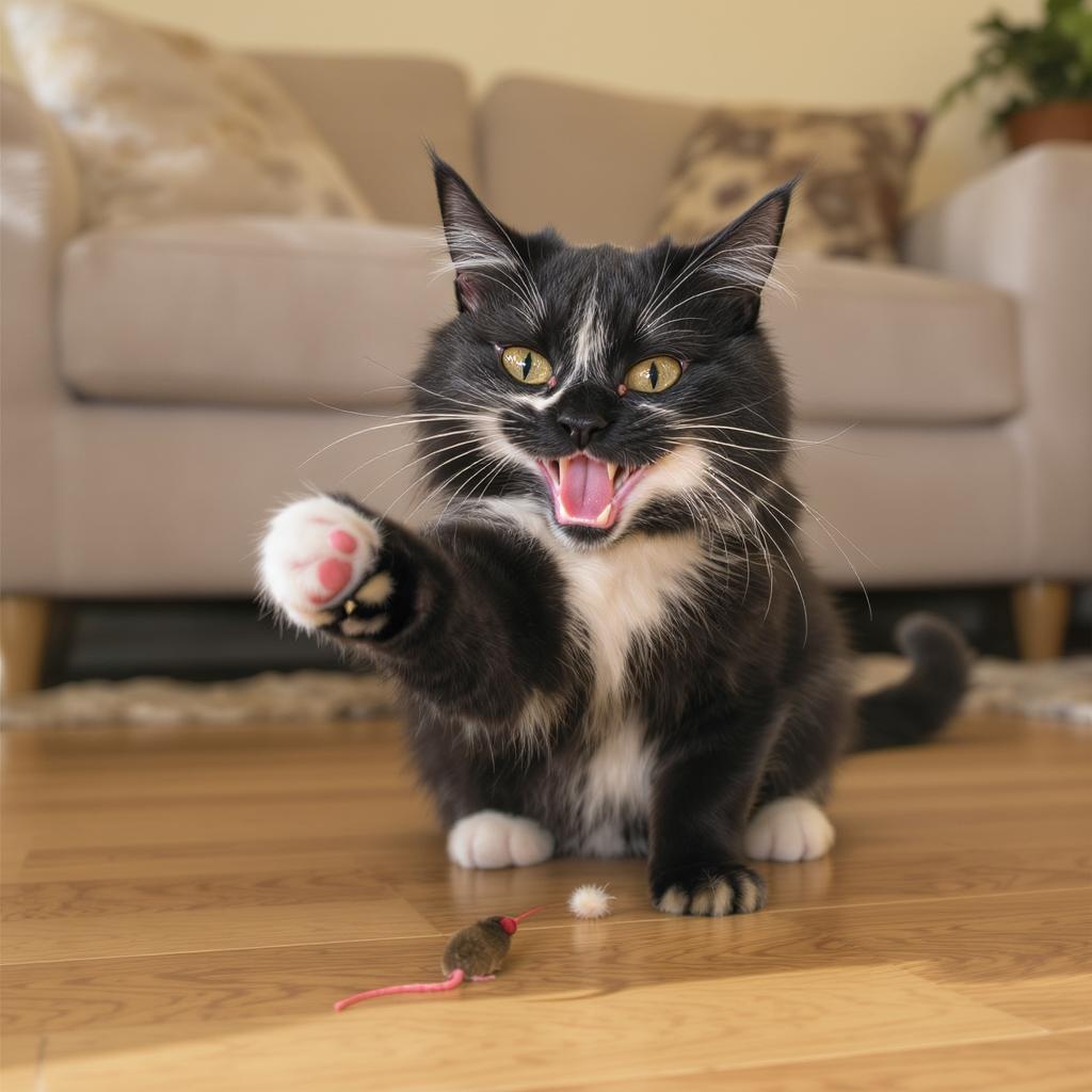 A mischievous cat with an infectious grin playfully bats at a toy mouse, its eyes gleaming with laughter and curiosity, as it orchestrates its own little comedy show in the living room.