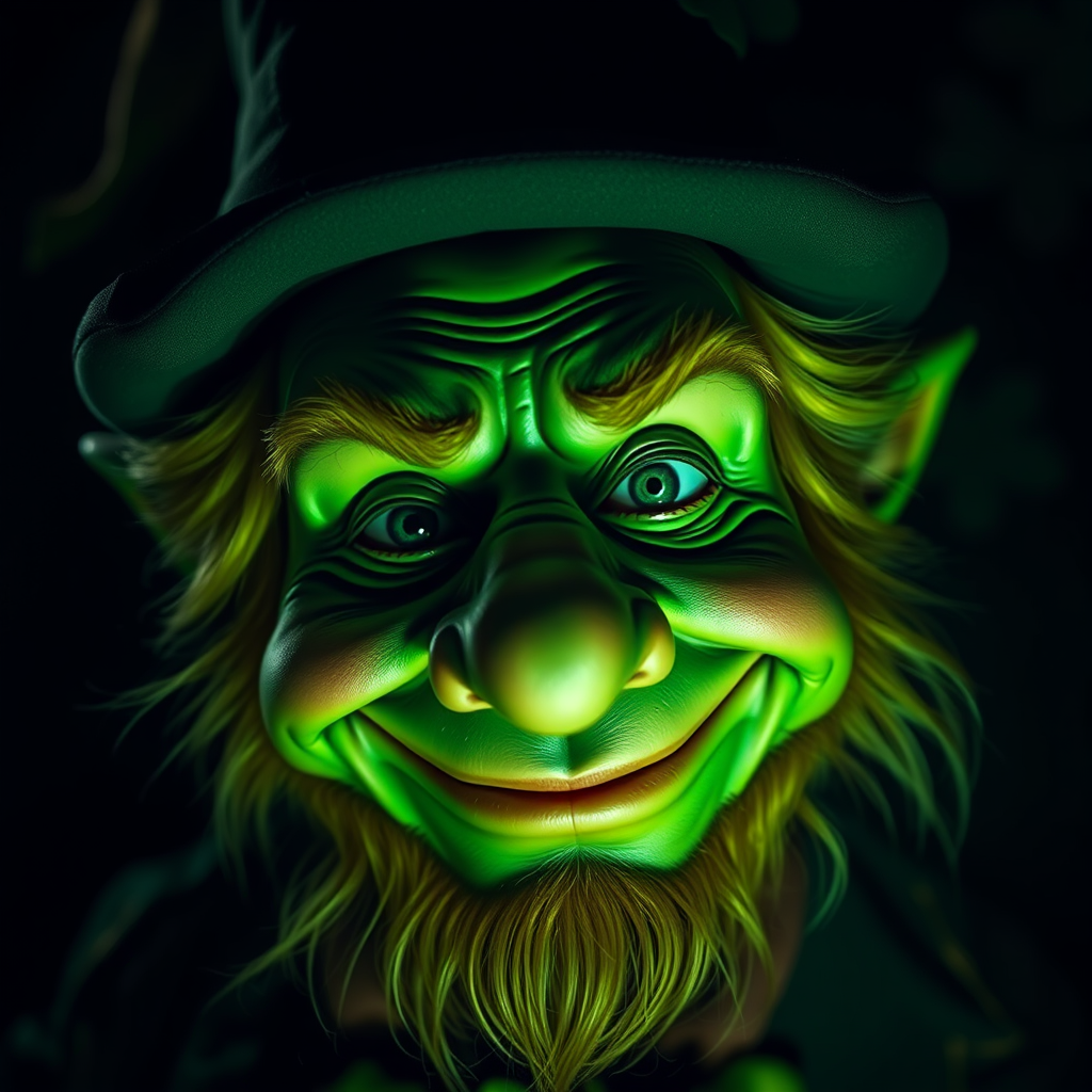 A mischievous leprechaun with a furrowed brow and playful grin, his face etched with wrinkles and character, adorned in vibrant shades of green that shimmer in the cinematic, moody lighting. The leprechaun stands out against a dark, shadowy background, his eyes twinkling with a hint of melancholy, suggesting tales untold. Soft beams of light highlight the contours of his mischievous expression, creating an atmosphere of mystery and whimsy.