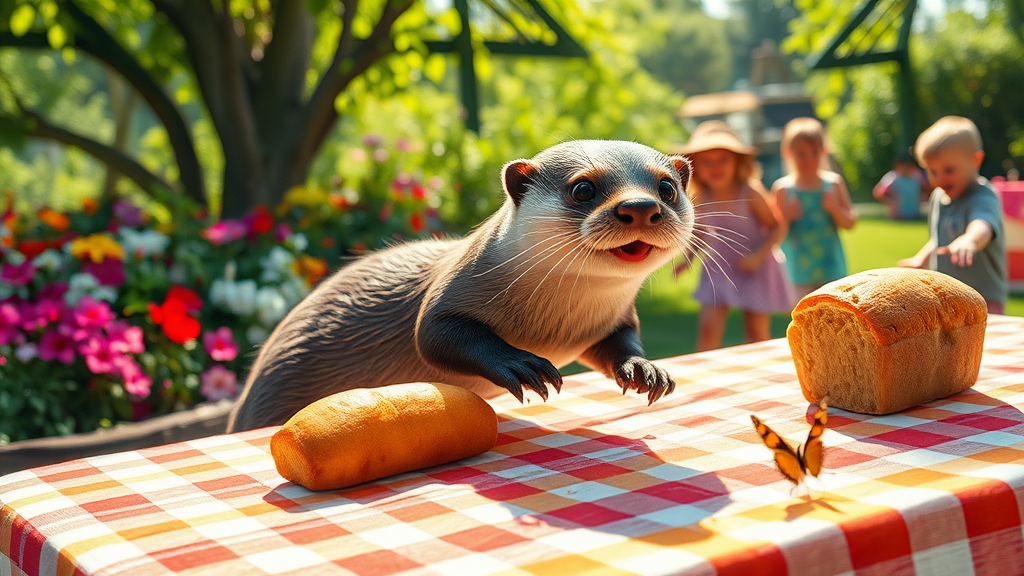 A mischievous otter with big, sparkling eyes and a playful grin tiptoes on its hind legs, sneaking up to a sunlit picnic table adorned with a colorful checkered cloth. The table is set in a lush, peaceful garden filled with vibrant flowers. The otter's sleek fur shimmers in the dappled sunlight as it reaches out with its tiny, dexterous paws to snatch a warm, golden loaf of bread. Nearby, a gentle breeze rustles the leaves, and a butterfly flits by, unnoticed by the otter, entirely focused on its heist. In the distance, two children play, their laughter echoing through the air, oblivious to the charming escapade unfolding behind them. The scene captures the whimsy and innocence of this endearing creature's daring adventure, a moment suspended in the joy of unexpected miracles.