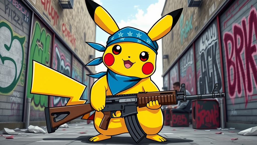 A mischievous Pikachu donning a blue bandana is posing confidently, holding a stylized, cartoonish version of an AK47. Surrounded by graffiti-laden urban walls and a few loyal gang members, this electric rodent exudes a playful but edgy attitude, blending its usual charm with a rebellious twist.