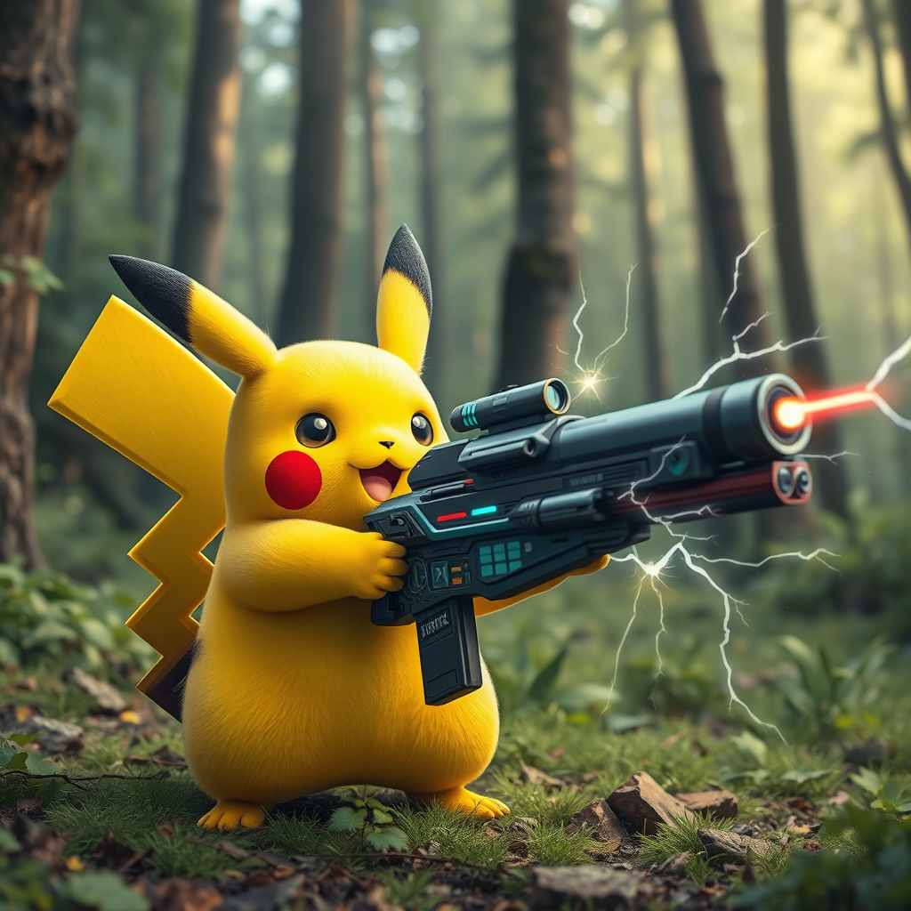 A mischievous Pikachu wielding a futuristic laser rifle in a lush forest setting, electric sparks crackling around it as it playfully aims the high-tech weapon.