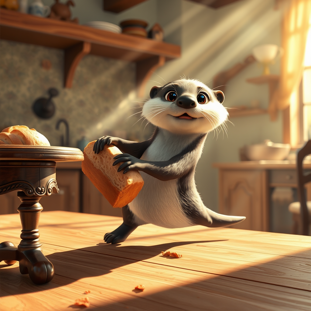 A mischievous yet endearing otter with glossy fur and sparkling eyes is whimsically navigating a sunlit kitchen, skillfully snatching a loaf of freshly baked bread from an ornate wooden table. The scene is reminiscent of a charming Pixar film, bursting with warmth and playful energy. Sunbeams dance across the room, highlighting the otter's agile moves as it cleverly darts around, bread in tow, leaving a trail of delight and crumbs. The moment is captured with vibrant colors and a touch of magic, evoking a sense of joyful mischief in a cozy, inviting atmosphere.