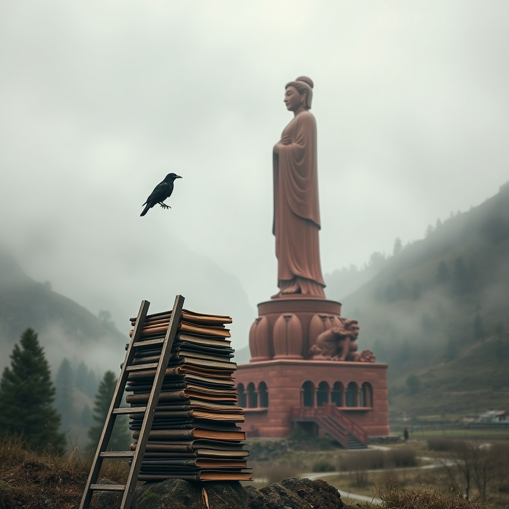 A mist-shrouded valley in northern China's Linghquan Mountains, with a towering standing pillar statue of a serene woman's figure, carved from copper-red stone, gazing out towards the distant Tian Shan range. The camera lingers at ground level, with a makeshift wooden ladder leaning against the statue's base, where a crow perches atop a stacked pile of weathered wood grain texts and weathered leather-bound scrolls. The atmospheric lighting is heavy and dreamlike, with the statue's form blending with the surrounding landscape in shades of warm red, rust, and faded gray.
